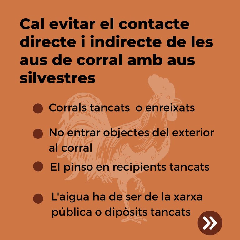 - Aquells ciutadans amb tinença d’aus de corral no registrades procedeixin a registrar-les i implementin mesures de bioseguretat per minimitzar el risc de contacte d’aus salvatges amb les aus de corral.